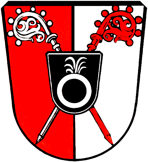 Alte historische Zusammenhänge macht das Auerbacher Gemeindewappen deutlich. Die offizielle Beschreibung lautet: "Gespalten von Rot und Silber mit zwei schräggekreuzten, durchgehenden Abtstäben in verwechselten Farben(versinnbildlicht die verschiedenen klösterlichen Grundbesitze) ihnen aufgelegt ein schwarzes Schildchen, darin ein oben mit silbernen Federn besteckter silberner Ring". (Wappen der Familie Schrag von Knöringen).