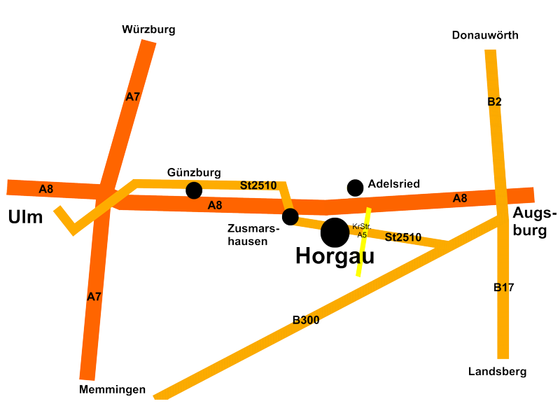 Von Ulm - Richtung Augsburg: Ab dem östlichen Stadtrand von Ulm über B 10 und St 2510 erreichen Sie über Zusmarshausen nach Horgau.